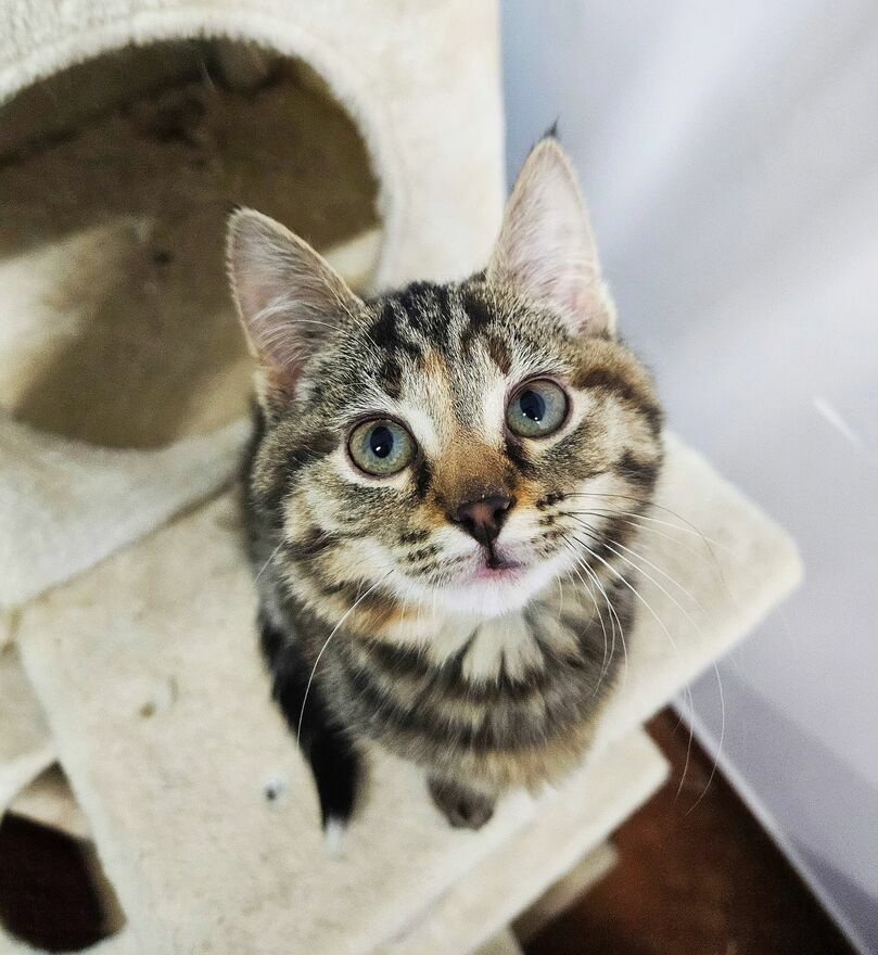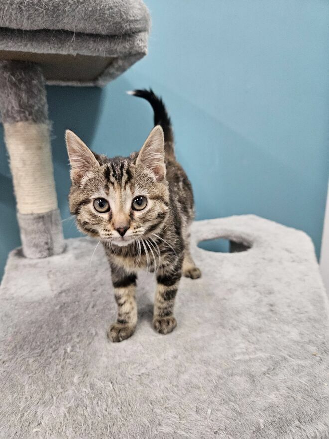Fluffy ma około 3–4 miesiące. Jest śliczną koteczką o wyjątkowym umaszczeniu – ciemne pręgowane futerko z rudymi przebarwieniami sprawia, że nie sposób przejść obok niej obojętnie.To radosne, kocie dziecko pełne życia. Uwielbia zabawę i rozczula swoim dziecięcym szaleństwem. Jest kontaktowa, ciekawska świata i świetnie dogaduje się z innymi kotami.