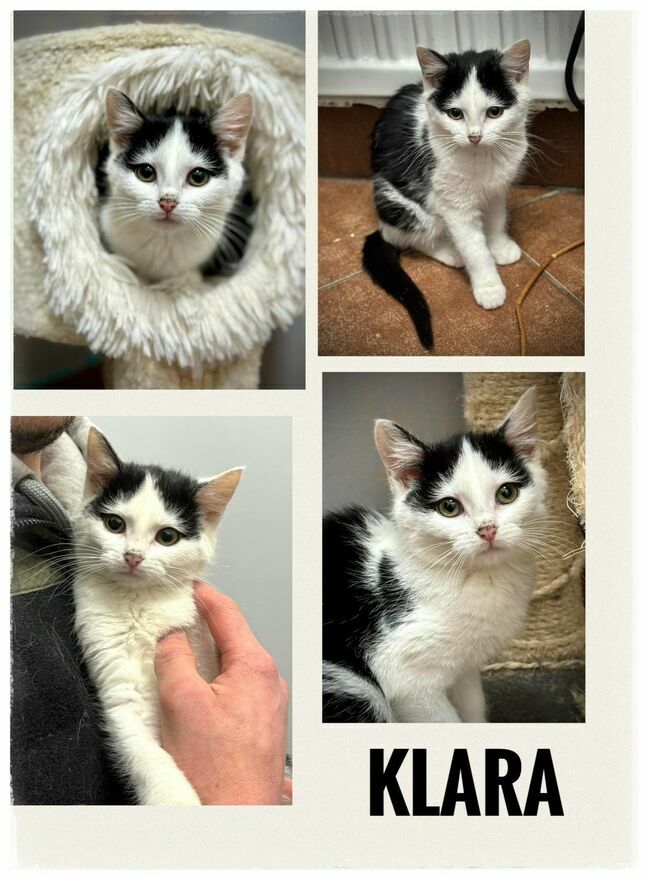 Klara – biało-czarna panienka z nutką nieśmiałości. Bez problemu pozwala się głaskać i brać na ręce, choć jeszcze uczy się, że kontakt z człowiekiem może być prawdziwą przyjemnością. Z każdą wizytą robi coraz większe postępy i śmiało stawia kolejne kroki ku byciu miziakiem.