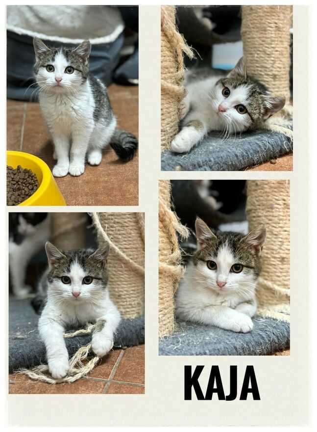 Kaja – biało-bura piękność, również jest odrobinę wycofana w kontaktach z ludźmi. Sama z siebie nie podchodzi i potrzebuje czasu, aby poczuć się swobodnie. Za to nadrabia temperamentem – jest bardzo zabawowa, wesoła i ciekawska. Z cierpliwym opiekunem ma ogromny potencjał, by w pełni się otworzyć.