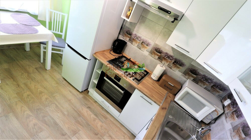 Kuchnia (poza zabudową meblową): lodówko-zamrażarka, piekarnik, płyta gazowa, kuchenka mikrofalowa, czajnik elektryczny, stół i 2 krzesła