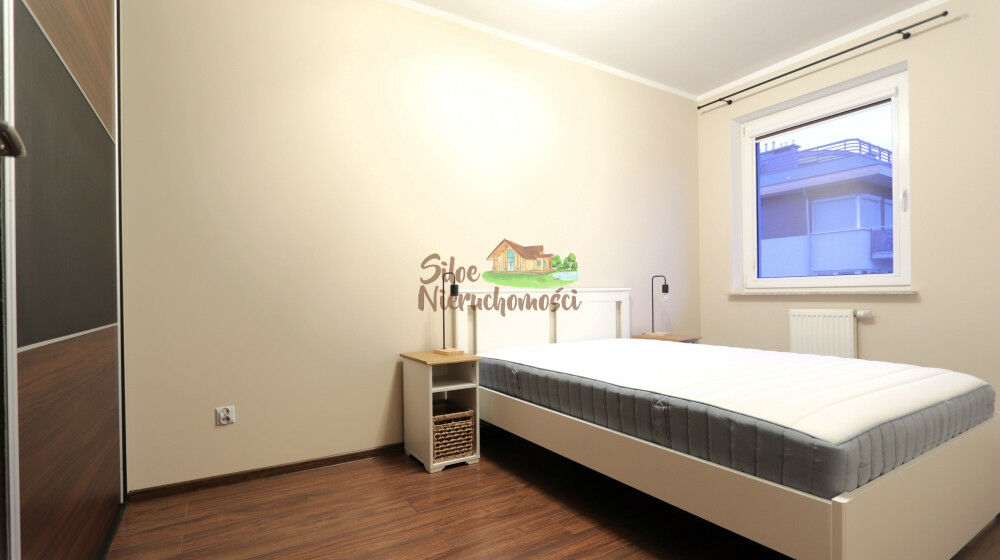 Sypialnia jest ustawna i wyposażona zarówno duże łóżko z wygodnym materacem, dwoma szafkami nocnymi z lampkami i zabudowaną szafą .