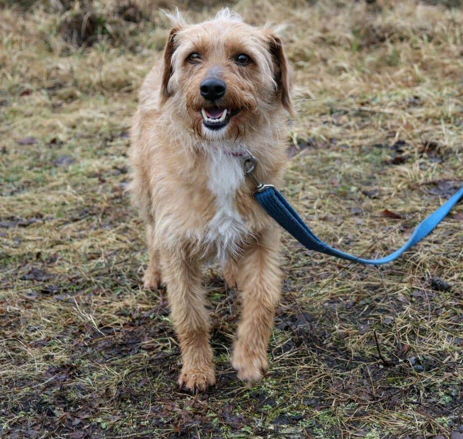 Jest dość ufny, choć na razie ostrożny wobec nowych osób. Na spacerach robi coraz większe postępy – staje się odważniejszy, potrafi już wesoło podbiec i zaprosić do zabawy.