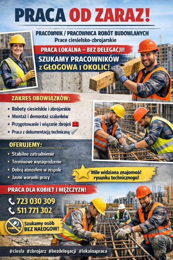 Szukamy pracowników do robót ciesielsko zbrojarskichwymagamy brak uzywek, tdoświadczenie, a czytanie rysyunku technicznego będzie dodatkowym atutem