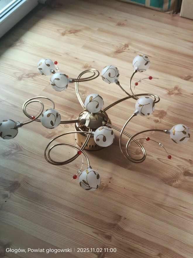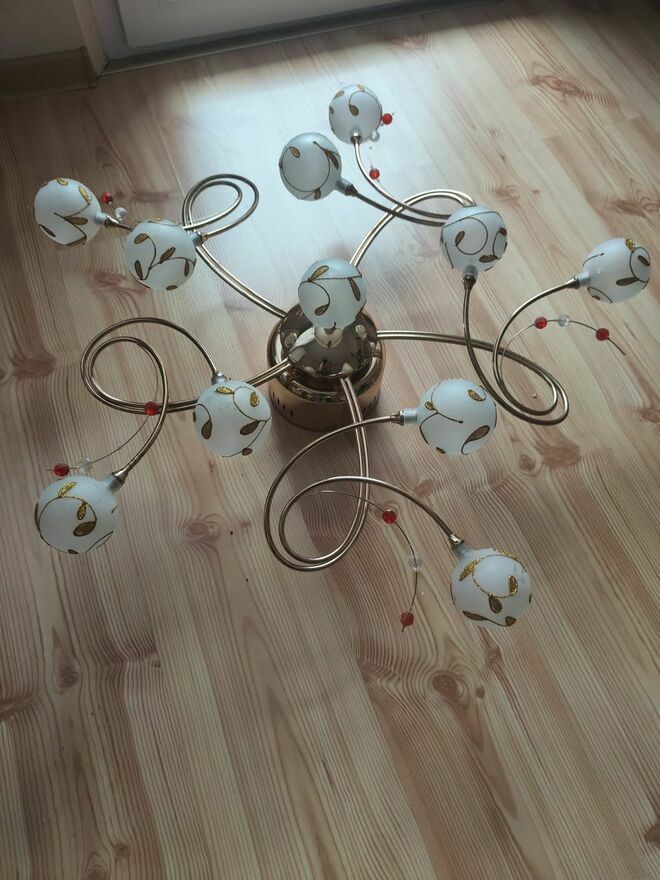 Używana lampa sufitowa w oryginalnym designie. Posiada metalową konstrukcję z białymi, okrągłymi kloszami. Całość prezentuje się elegancko.Polecam